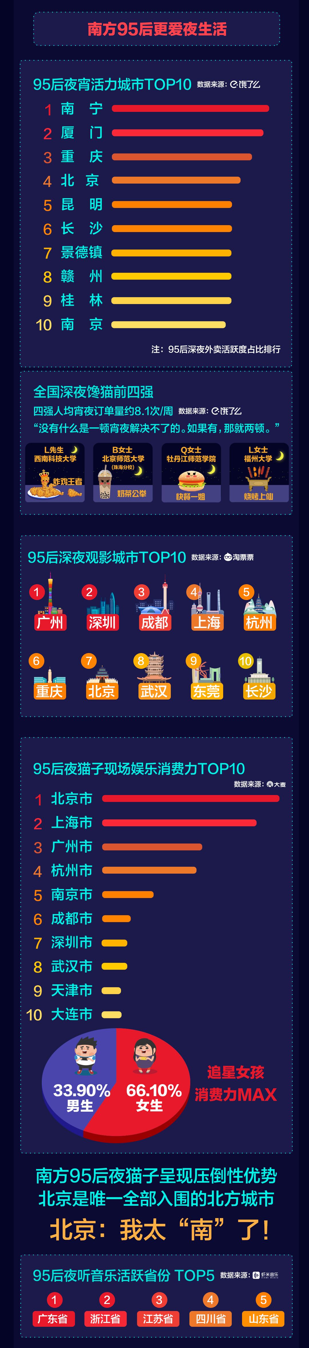 《95后夜貓子報(bào)告》綜合數(shù)據(jù)顯示,無論是觀影、追星、聽音樂,還是吃宵夜,南方95后夜貓子的活躍度都呈現(xiàn)壓倒性優(yōu)勢(shì)。95后宵夜活力城市TOP10、95后深夜觀影城市TOP10、95后夜貓子現(xiàn)場(chǎng)娛樂消費(fèi)力TOP10榜單里,入圍城市均以南方城市為主。