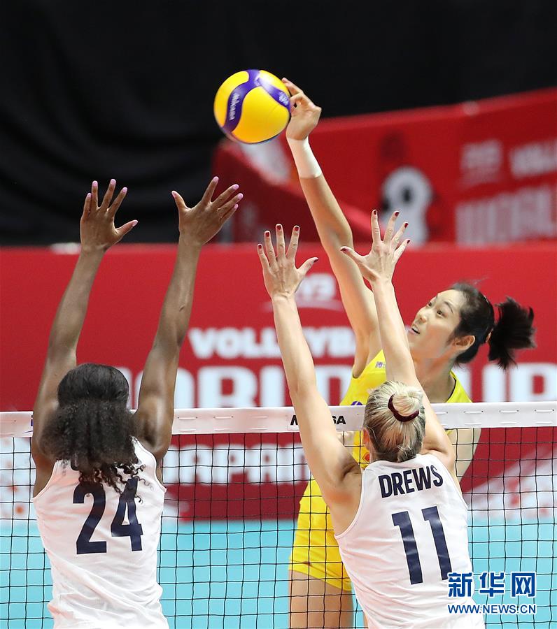 9月23日,中國隊球員朱婷(右)在比賽中扣球。當日,在日本札幌舉行的2019年女排世界杯賽第二階段A組循環(huán)賽中,中國隊以3比0戰(zhàn)勝美國隊。新華社記者杜瀟逸攝