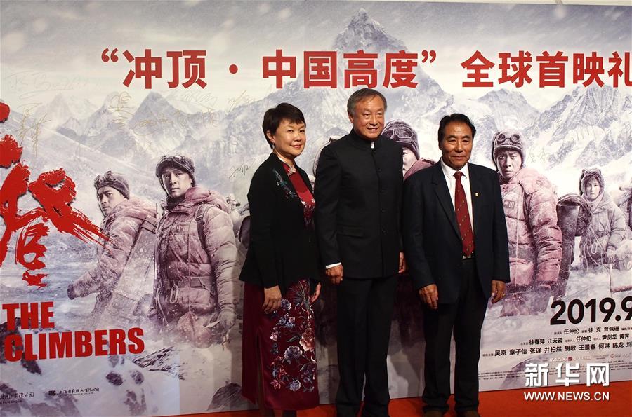 9月27日,原中國登山隊員桑珠(右一)和登山家夏伯渝(中)參加電影《攀登者》全球首映禮。新華社記者任瓏攝