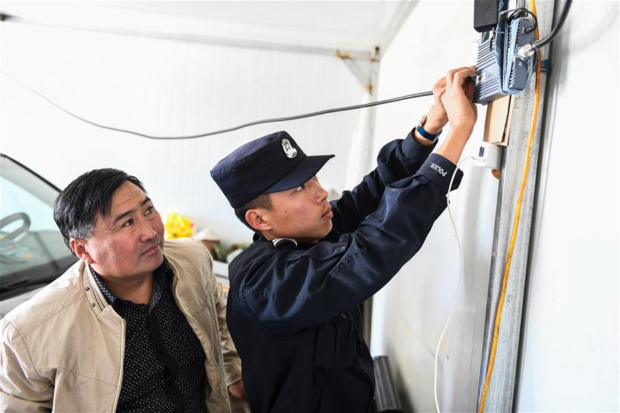 9月25日,內(nèi)蒙古自治區(qū)額濟(jì)納旗算井子邊境派出所民警崔現(xiàn)浦(右)在幫牧民敖其爾修理家用電器。新華社記者劉磊攝