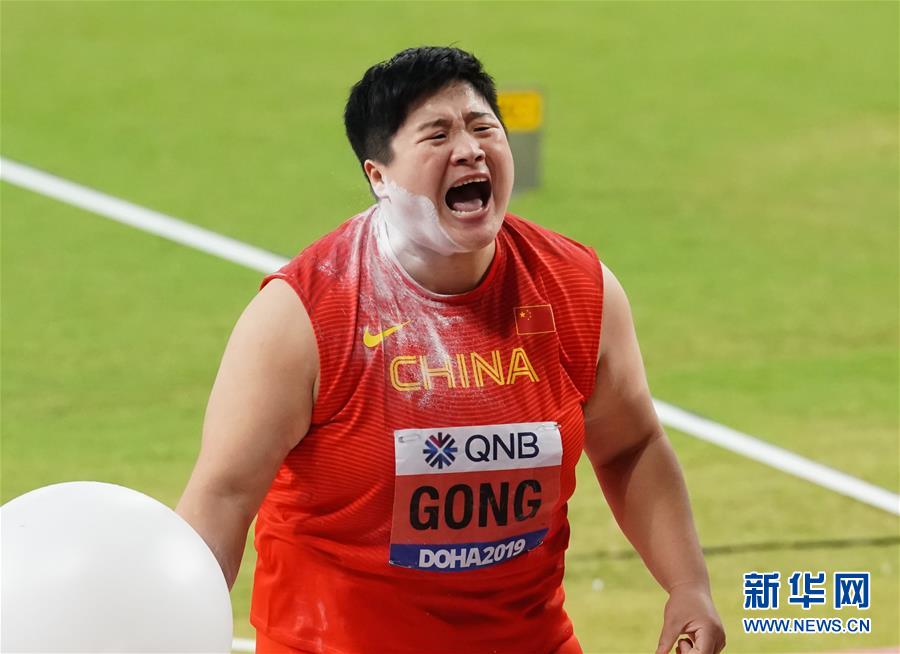 當日,在卡塔爾多哈舉行的2019國際田聯(lián)世界田徑錦標賽女子鉛球決賽中,衛(wèi)冕冠軍、中國選手鞏立姣以19米55的成績奪得冠軍。 新華社記者王婧嬙攝