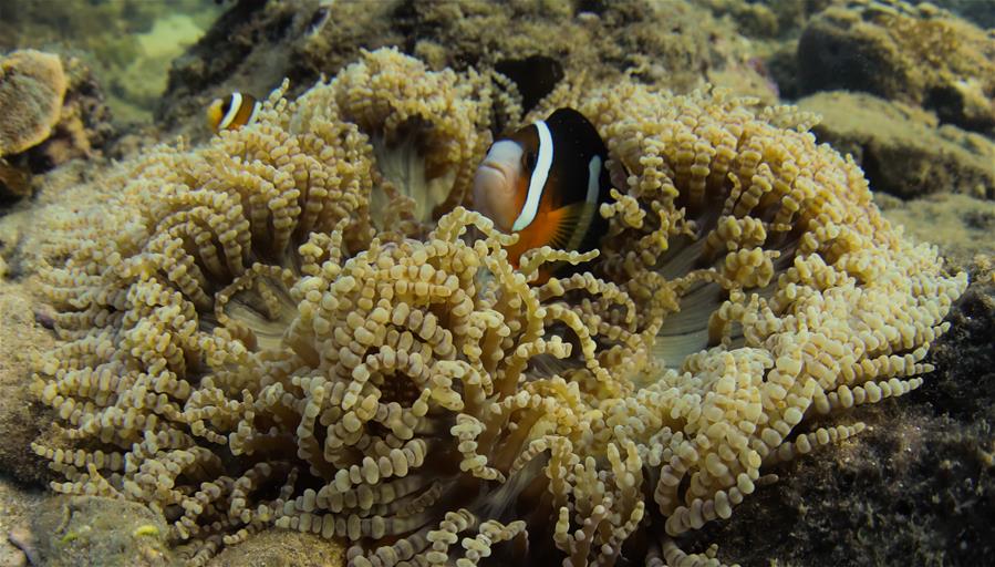 在分界洲島海域,小丑魚在??杏蝿?dòng)(10月4日攝)。