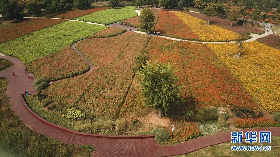 10月9日,游人在四季花海城市公園游覽(無人機(jī)拍攝)。 秋日時(shí)節(jié),位于安徽省合肥市的四季花海城市公園花香四溢,色彩繽紛,成為游客和市民休閑游玩的好去處。 新華社記者 張端 攝