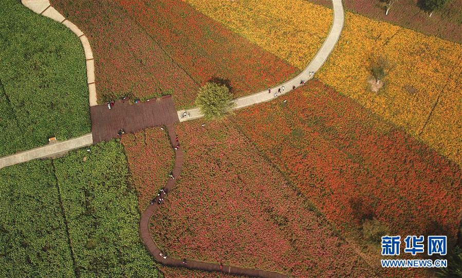 10月9日無(wú)人機(jī)拍攝的四季花海城市公園風(fēng)景。 秋日時(shí)節(jié),位于安徽省合肥市的四季花海城市公園花香四溢,色彩繽紛,成為游客和市民休閑游玩的好去處。 新華社記者 張端 攝