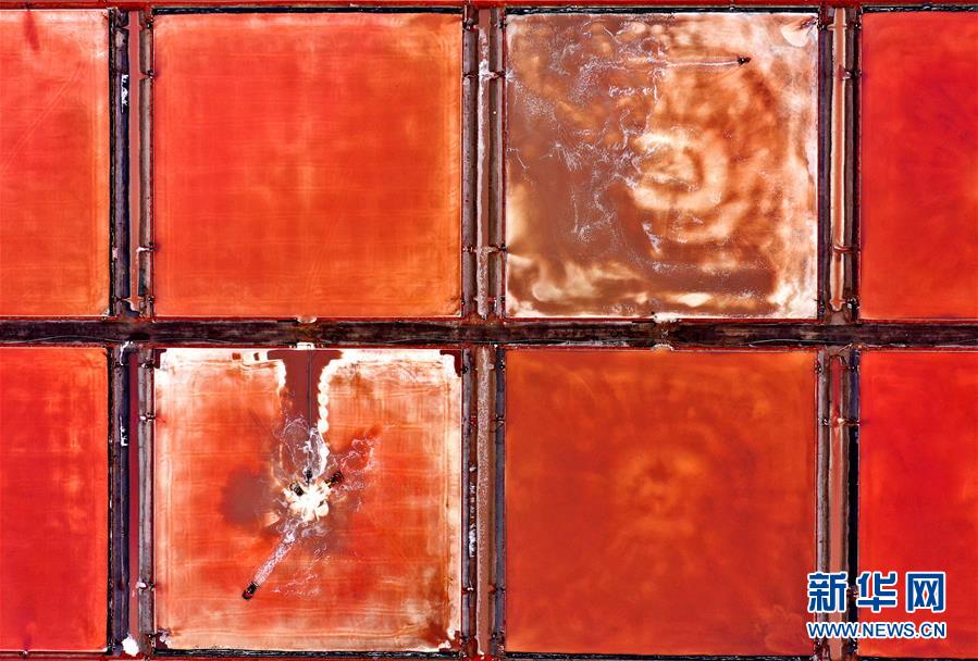 魯北鹽場(chǎng)工人在鹽池中收獲海鹽(10月9日無人機(jī)拍攝)。新華社記者 朱崢 攝