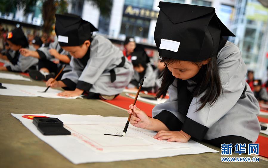 10月13日,參加儀式的小朋友在書寫“人”字。當日,??诤嬌賰核囆g中心為500名小朋友舉行“開筆禮”,通過“點朱砂,啟智慧”“習書法,描人字”等儀式讓孩子們體驗中國傳統(tǒng)文化。新華社記者郭程攝