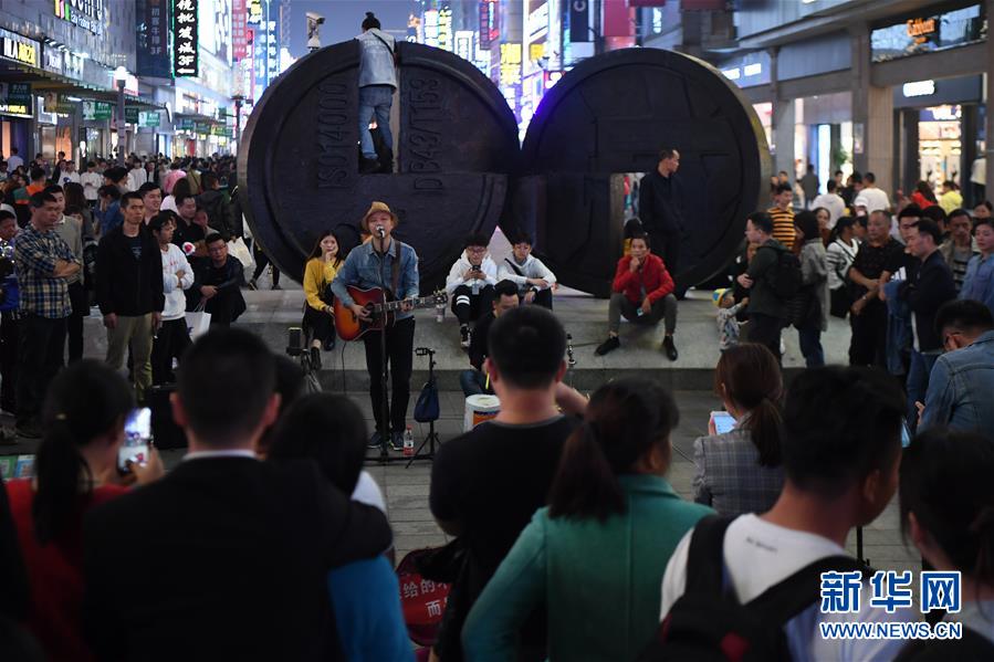 10月12日,長(zhǎng)沙黃興路步行街持證上崗的街頭藝人在表演時(shí)吸引路人圍觀。新華社記者薛宇舸攝