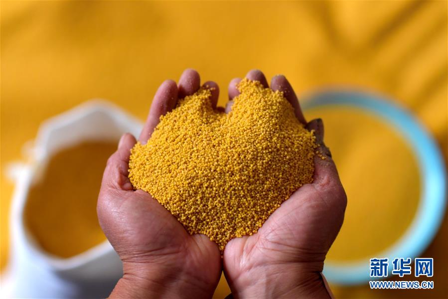 在奪火鄉(xiāng)高谷堆村,村民展示收獲的小米(10月14日攝)。 新華社記者 曹陽 攝