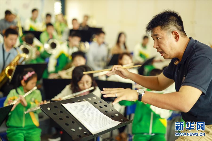 10月12日,重慶市特殊教育中心排練廳,中國人民解放軍軍樂團的指揮王登梅在指導揚帆管樂團的盲童和老師們排練。