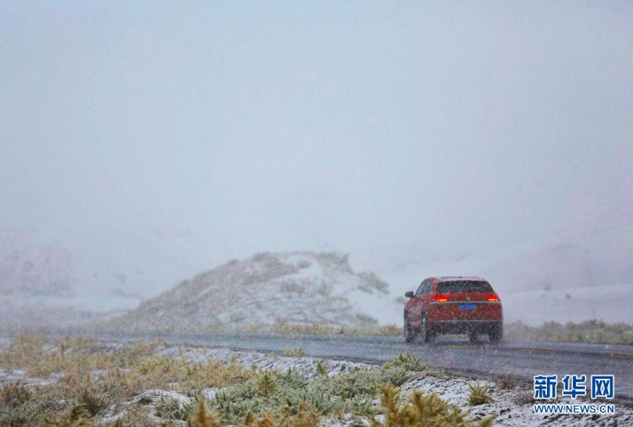 10月15日,在寧夏中衛(wèi)市沙坡頭景區(qū),汽車在大雪中行進。新華網(wǎng)杜文杰攝
