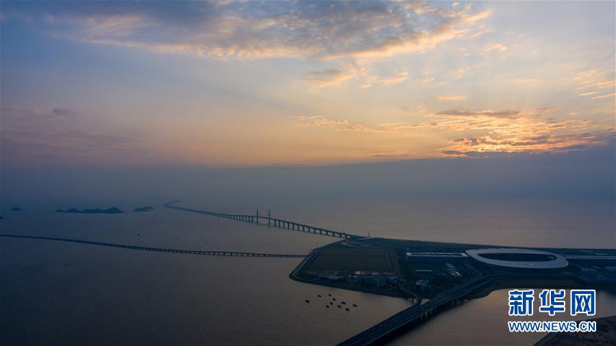 晨曦中的港珠澳大橋珠澳口岸人工島(10月24日無人機(jī)拍攝)。2018年10月23日,港珠澳大橋正式開通。在這座圓夢橋、同心橋、自信橋、復(fù)興橋開通一周年之際,記者親自體驗“一橋連三地、一日游三城”的悠閑與便利,于不同的旖旎風(fēng)光中自在游覽,在不同的城市風(fēng)貌間自如切換。新華社記者張金加攝