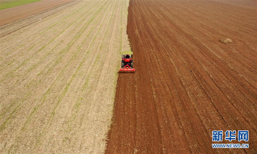 河南省寶豐縣趙莊鎮(zhèn)周營(yíng)村農(nóng)民駕駛機(jī)械在農(nóng)田里犁地(10月17日無(wú)人機(jī)拍攝)。