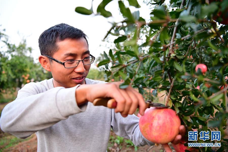 在河南省南陽市淅川縣九重鎮(zhèn)張河村,農民在軟籽石榴基地采摘石榴(10月19日攝)。新華社記者馮大鵬攝