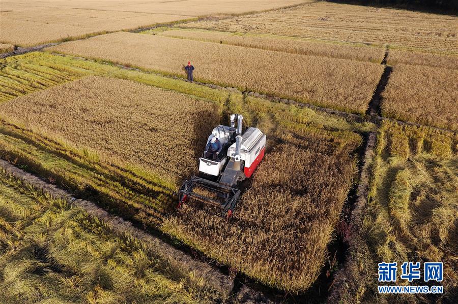 在太原市晉源區(qū)赤橋村,收割機(jī)在稻田里作業(yè)(10月28日無(wú)人機(jī)拍攝)。新華社記者詹彥攝