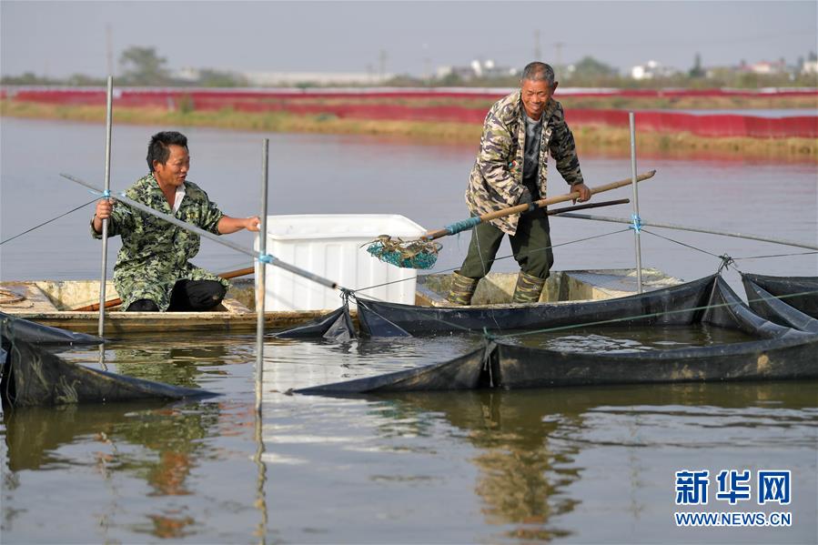 江西省南昌市新建區(qū)象山鎮(zhèn)河林村農(nóng)戶正在大閘蟹養(yǎng)殖基地進(jìn)行捕撈(10月29日攝)。 新華社記者 彭昭之 攝