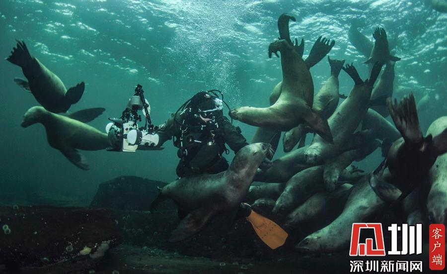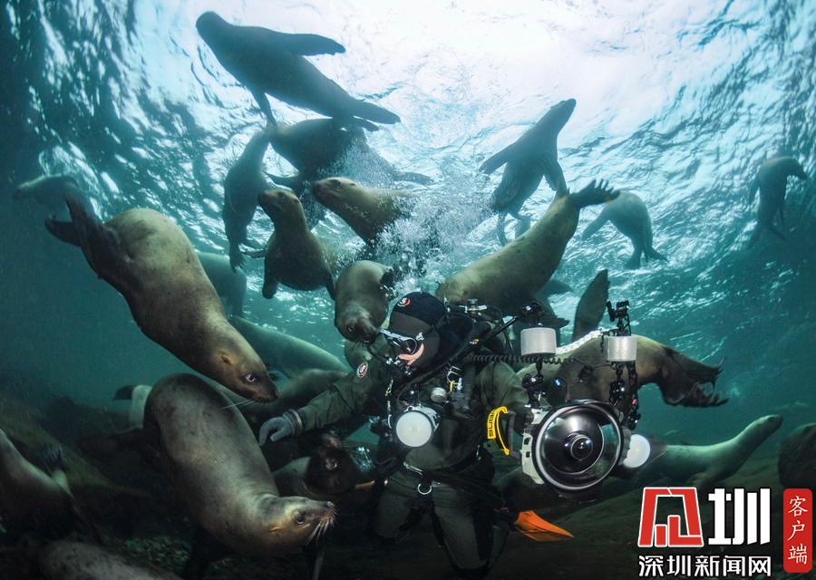32歲的 Maxwel Hohn是一名水下攝影師,日前,他潛入加拿大溫哥華海域,沒想到撞見海獅“大軍”,這50來只家伙對于 Maxwel的出現(xiàn)興奮不已,立刻將他團(tuán)團(tuán)圍住,仿佛進(jìn)了盤絲洞。
