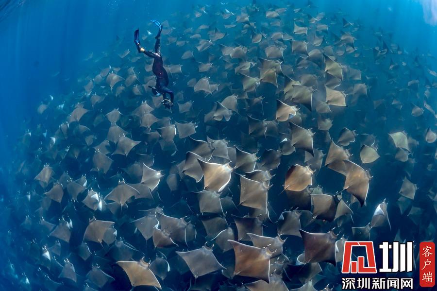 2019年5月31日報道(圖片拍攝于4月23日),環(huán)?;顒蛹壹鏉撍叹欽ay Clue上個月在墨西哥下加利福尼亞州洛斯卡沃斯附近海岸,幸運(yùn)地邂逅了一支蝠鲼遷徙大軍,數(shù)百只蝠鲼浩浩蕩蕩在海水中行進(jìn),畫面十分震撼。
