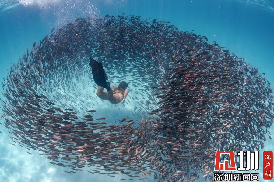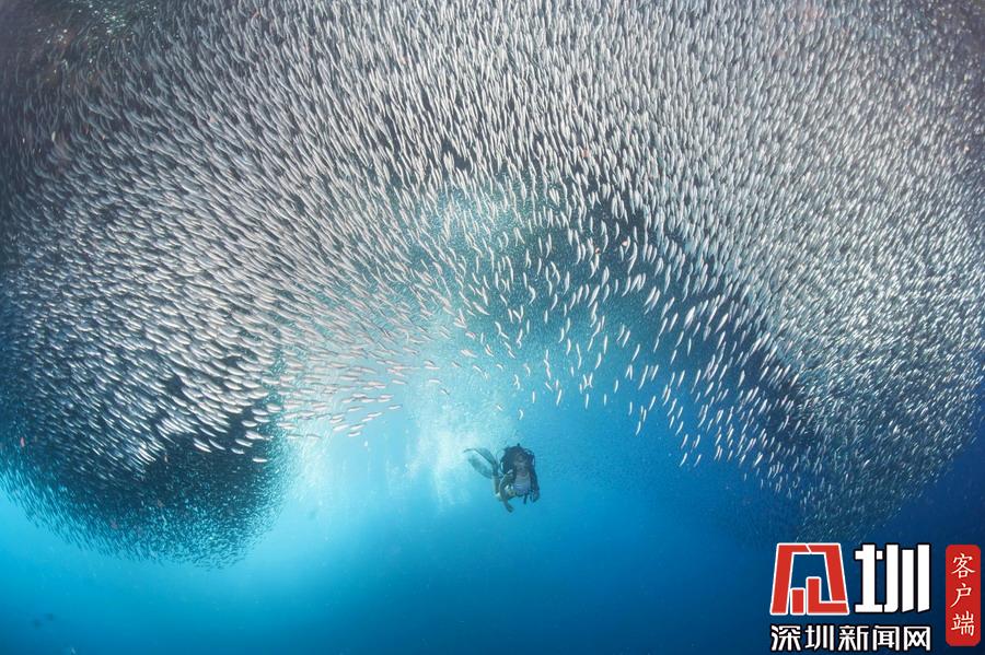 2018年12月24日報道(具體拍攝時間不詳),這張驚艷的照片記錄了沙丁魚大軍為一位幸運(yùn)的潛水員讓路的瞬間,數(shù)百萬條銀光閃閃的小魚兒簇?fù)韲@在他的一側(cè),恰似熠熠生輝的繁星,如眾星捧月一般畫面十分驚艷。