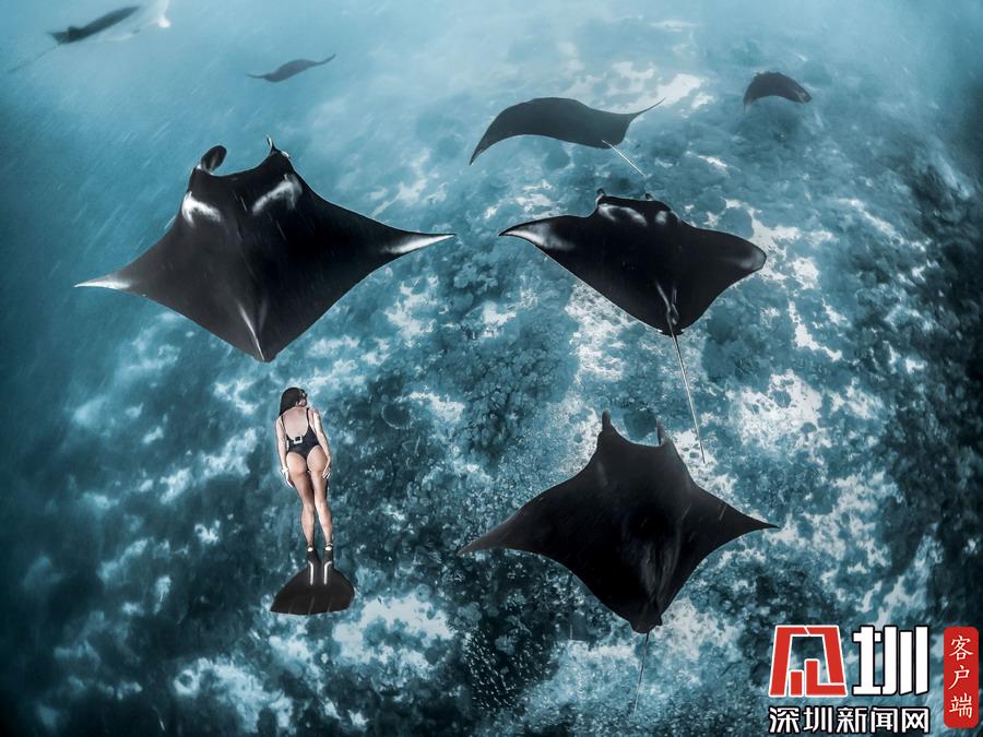 2019年7月2日報道(具體拍攝時間不詳),印度尼西亞科莫多國家公園,美國自由潛水愛好者Kristina Zvaritch一次潛水時,她的正下方恰巧游著幾只巨大的蝠鲼,這令人驚艷的一幕恰巧被她的丈夫拍下來了。當(dāng)她看到這些照片時,自己都被驚呆了。晶瑩剔透的海水使這張照片有了視覺錯位的效果,讓人以為Kristina與這些魚處于相同的高度,但實(shí)際上她離這些魚還有10-19英尺左右的距離。