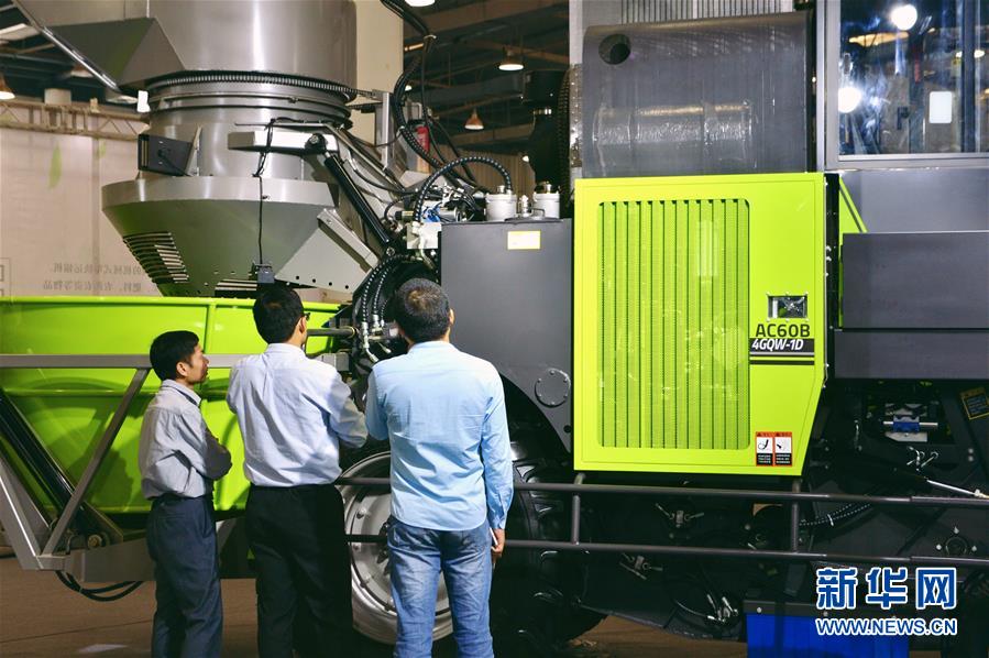 11月16日,參觀者在展會現(xiàn)場參觀甘蔗收割機械設備。