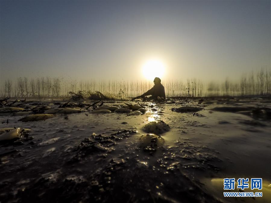 2月1日,在雄安新區(qū)安新縣東向陽村的一處藕塘,一名挖藕工在水里工作。新華社記者沈伯韓攝