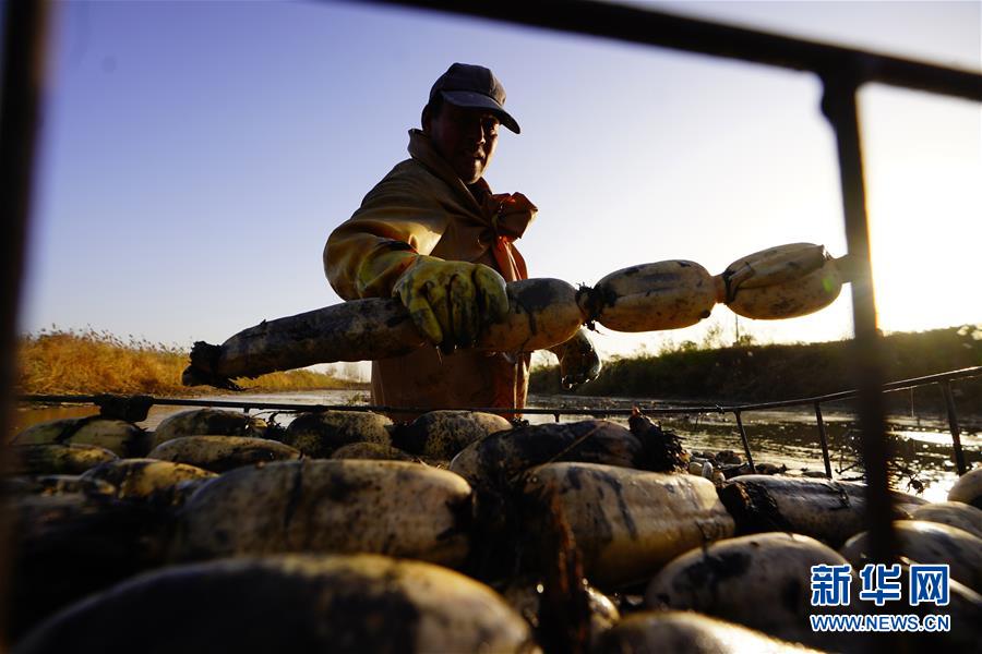 11月18日,工人在采收蓮藕。初冬時節(jié),河北省唐山市曹妃甸蓮藕豐收,工人們在結冰之前忙著采收蓮藕。新華社記者邢廣利攝
