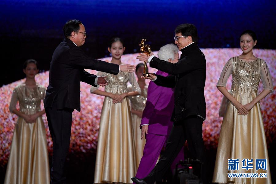 11月23日,電影《流浪地球》獲得最佳故事片獎(jiǎng),成龍?jiān)跒殡娪俺銎贩酱眍C獎(jiǎng)。 當(dāng)日,第32屆中國電影金雞獎(jiǎng)?lì)C獎(jiǎng)典禮在福建廈門舉行。 新華社記者 姜克紅 攝