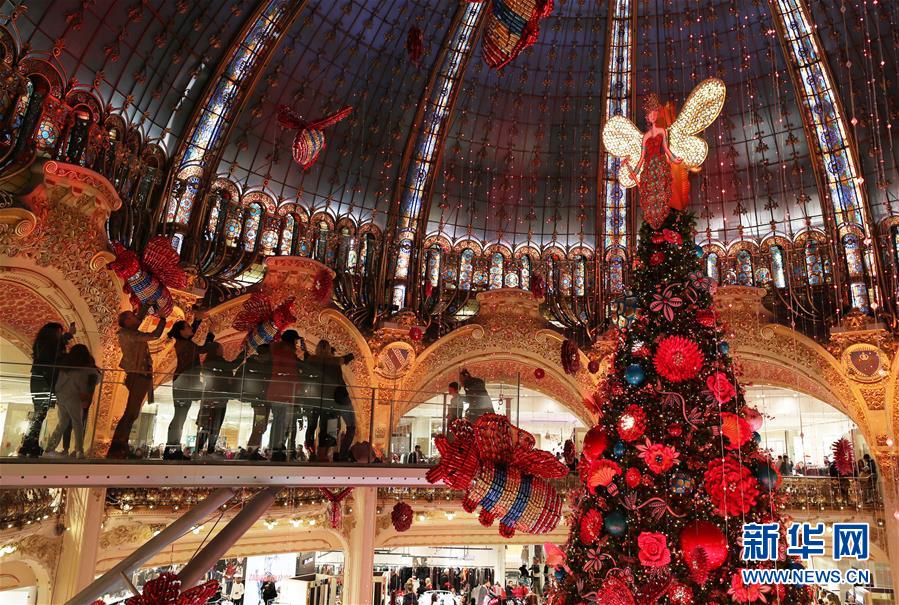 11月24日,在法國(guó)巴黎老佛爺百貨公司,人們?cè)诓Aё呃壬蠀⒂^點(diǎn)燈后的巨型圣誕樹(shù)。 新華社記者高靜攝