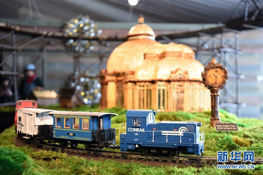 11月26日,在美國(guó)紐約植物園節(jié)日小火車展上,一輛模型小火車駛過(guò)紐約植物園溫室微縮模型。