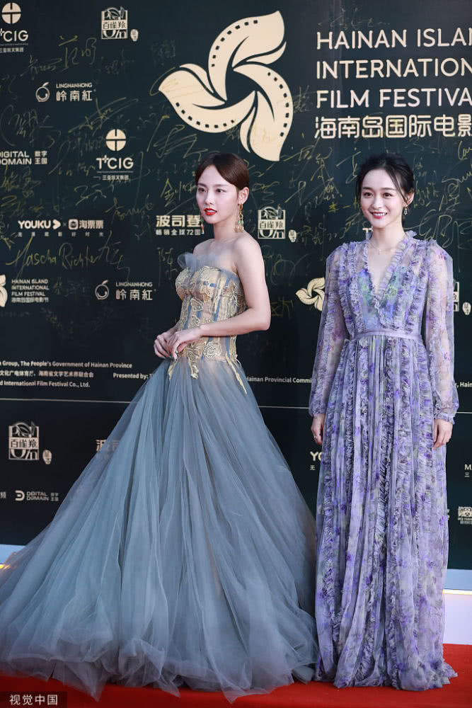 2019年12月1日,三亞,第二屆海南島國(guó)際電影節(jié)。何泓姍彎腰為張嘉倪整理裙擺,跟此前劇中傲嬌跋扈的“玫嬪”人設(shè)大不相同。