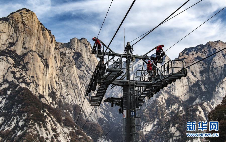 華山太華索道維修人員在進(jìn)行索道支架橫擔(dān)檢測(12月5日攝)。