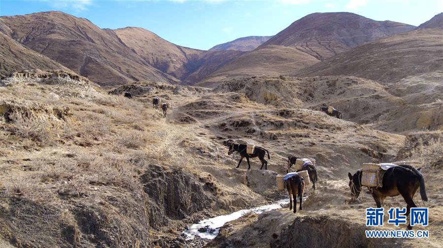 12月6日,騾馬隊馱負工程物料前往山頂塔基施工現(xiàn)場。新華社記者李楨宇攝