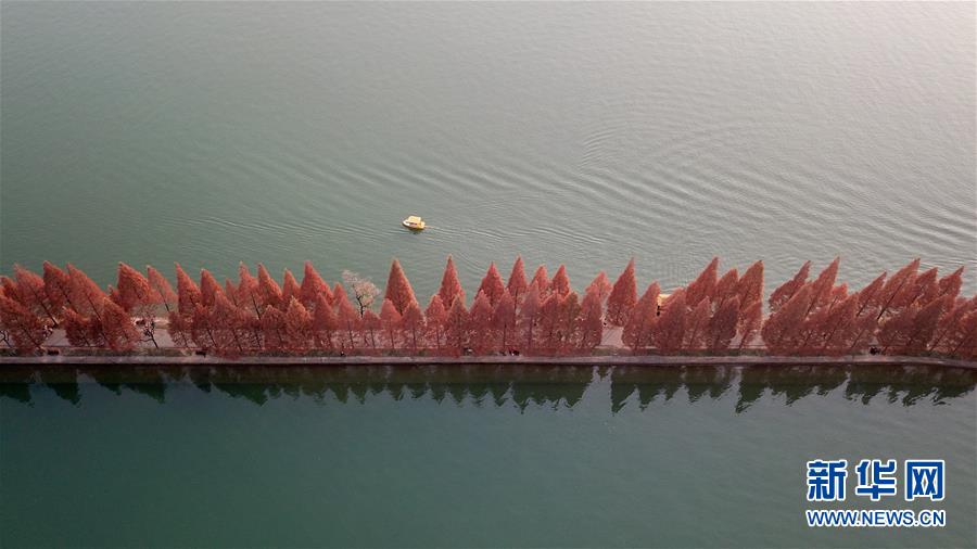 12月10日,一只小船在湖南烈士公園年嘉湖湖面行駛時經(jīng)過游道(無人機拍攝)。新華社記者陳澤國攝