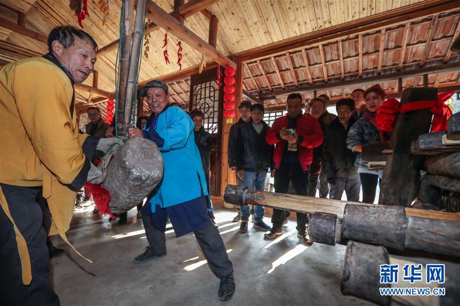 12月15日,游客在老油坊中體驗(yàn)以傳統(tǒng)方式給茶籽脫殼。 新華社記者 徐昱 攝