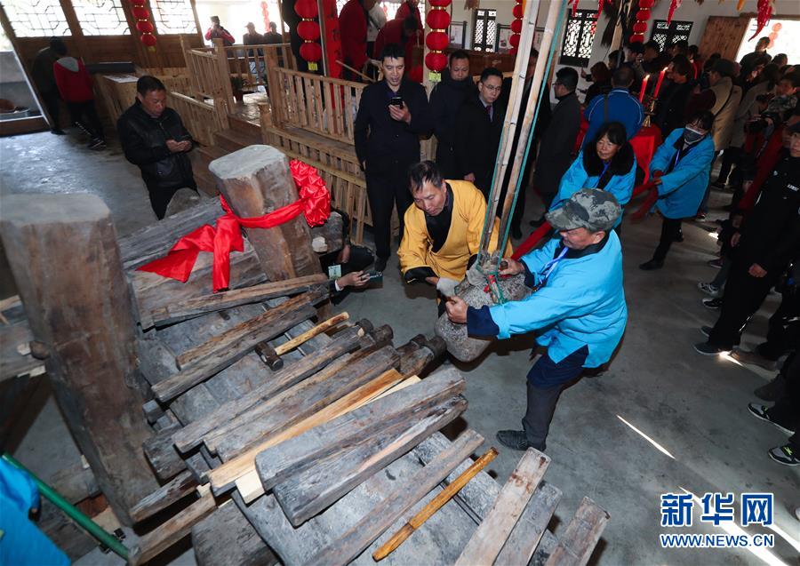 12月15日,工作人員在老油坊內(nèi)通過(guò)撞擊的方式將不同尺寸的木楔插入木龍,進(jìn)而榨出茶餅中的茶油。 新華社記者 徐昱 攝