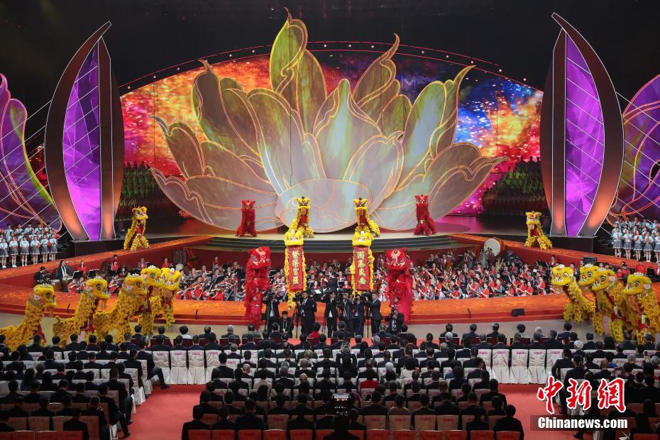 12月19日晚,慶祝澳門回歸祖國20周年文藝晚會在澳門東亞運動會體育館舉行。圖為《南粵舞獅》。中新社記者謝光磊攝