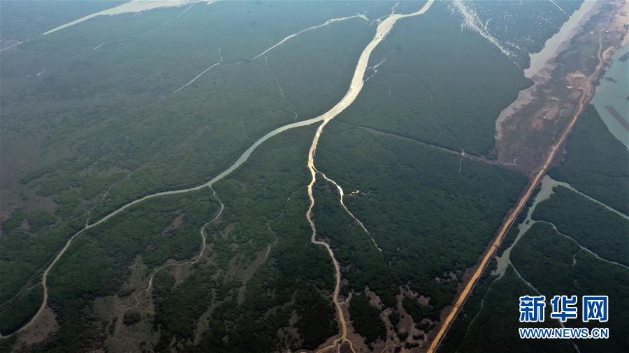 12月21日無人機拍攝的廣西合浦縣黨江鎮(zhèn)更螺圍出海口一景。冬日,廣西廉州灣海域風(fēng)光別致。新華社記者張愛林攝