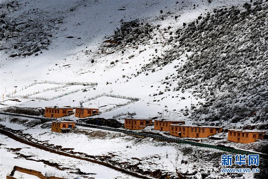 川藏線四川理塘縣境內(nèi)的雪山和民居(10月17日攝)。新華社記者陳天湖攝
