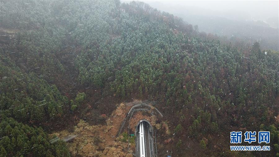 列車駛出金寨火車站派出所管轄的鐵路線路(12月19日無人機拍攝)。新華社記者張端攝