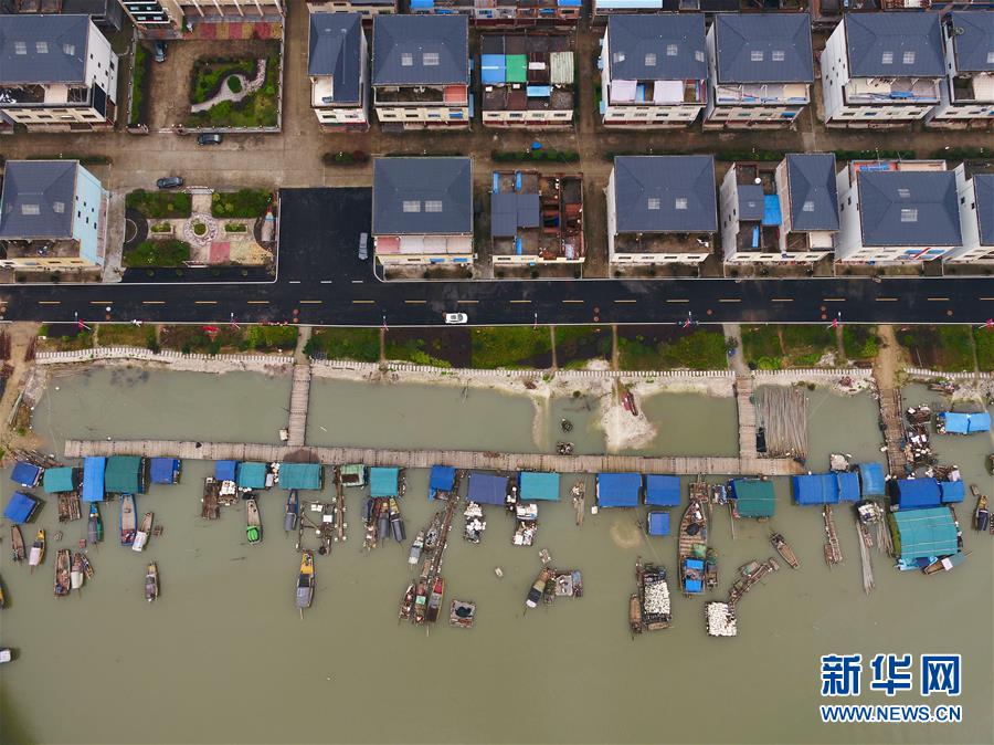 在寧德福安市溪邳村,一艘漁船經(jīng)過(guò)岸上新居(3月8日無(wú)人機(jī)拍攝)。新華社記者姜克紅攝
