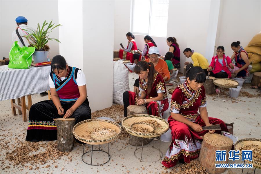 在大興地鎮(zhèn)維拉壩“珠海小區(qū)”內(nèi)的農(nóng)產(chǎn)品加工扶貧車(chē)間,村民李南珍在剝核桃仁(6月24日攝)。新華社記者秦晴攝