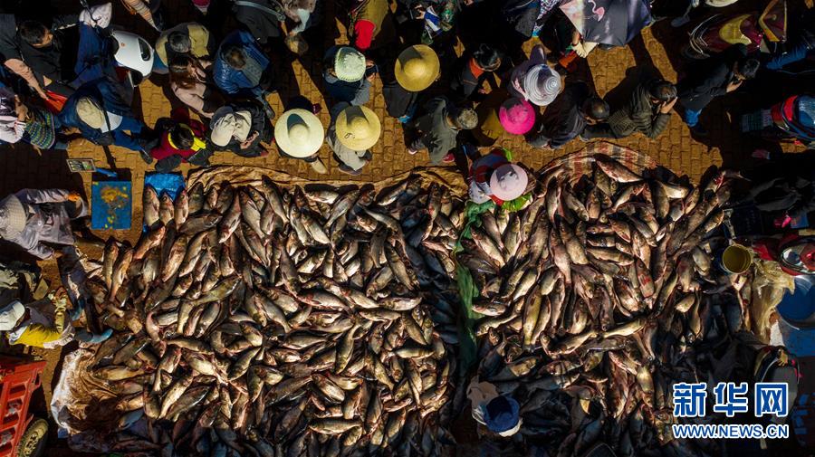 12月25日,人們在星云湖畔的老河咀魚市選購剛捕撈的鮮魚(無人機拍攝)。新華社記者胡超攝