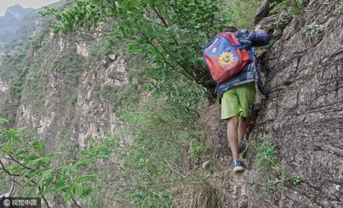 爬山開始前,陳木黑被陳古吉系上背包繩。前面由一個(gè)家長(zhǎng)引路,中間一個(gè)家長(zhǎng),陳古吉帶著陳木黑走最后,6歲的陳木黑已經(jīng)在這條路上,上上下下幾十次了。圖片來源:視覺中國