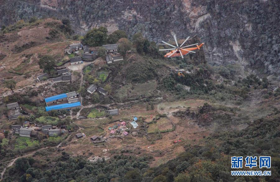 米-26重型直升機吊運一臺挖掘機飛抵阿布洛哈村上空(2019年12月3日攝)。通村公路的施工單位四川路橋租用一架米-26重型運輸直升機,克服高山峽谷、天氣多變等不利因素,從布拖縣城吊運大型施工設(shè)備到阿布洛哈村,為兩邊分頭掘進施工提供大型機械保障。新華社記者江宏景攝