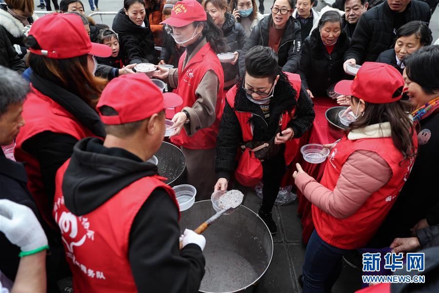 1月2日,志愿者在閬中古城貢院廣場給大家發(fā)放臘八粥。 當(dāng)日是農(nóng)歷臘月初八臘八節(jié),四川閬中古城舉行“萬人同品臘八粥”活動,當(dāng)?shù)鼐用窈捅姸嘤慰驮谪曉簭V場免費享用臘八粥。 新華社記者 江宏景 攝