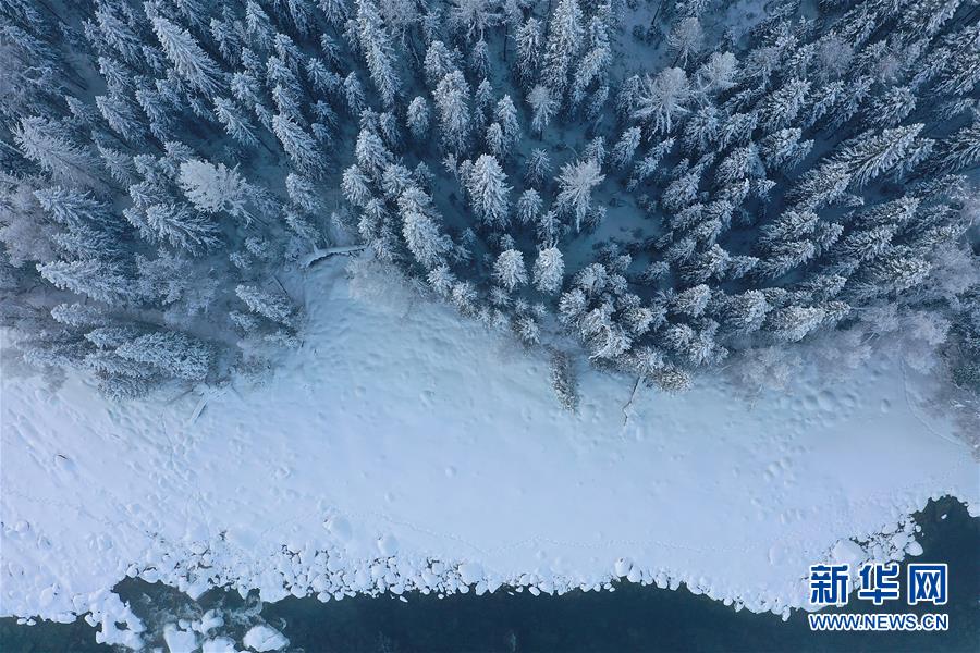 這是1月3日拍攝的喀納斯河畔的霧凇景觀(無(wú)人機(jī)照片)。新華社記者宋彥樺攝