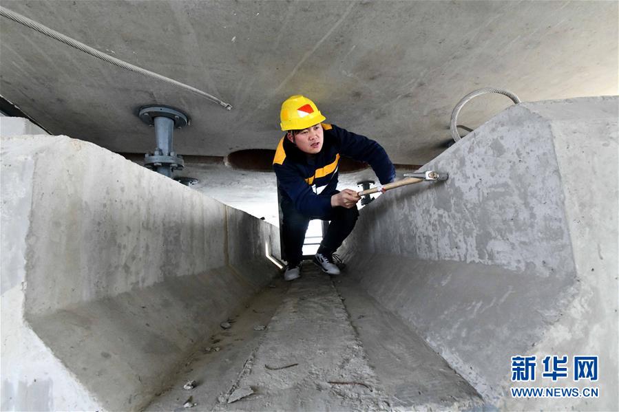 1月3日,中國鐵路濟南局臨沂工務(wù)段工程技術(shù)員李奔騰在沂河特大橋橋梁連接處檢查。新華社記者 朱崢攝