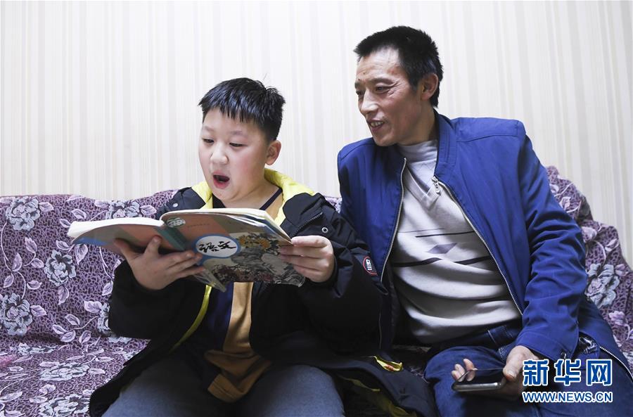 晚飯后,12歲的兒子冉俊超在家里朗誦課文,冉光輝在一旁聽(1月5日攝)。新華社記者王全超攝
