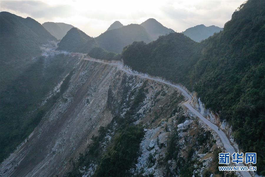 八好村駐村第一書(shū)記韋德王徒步前往弄麻屯開(kāi)展扶貧工作,弄麻屯的公路尚在建設(shè)當(dāng)中(2019年12月16日攝)。新華社記者黃孝邦攝