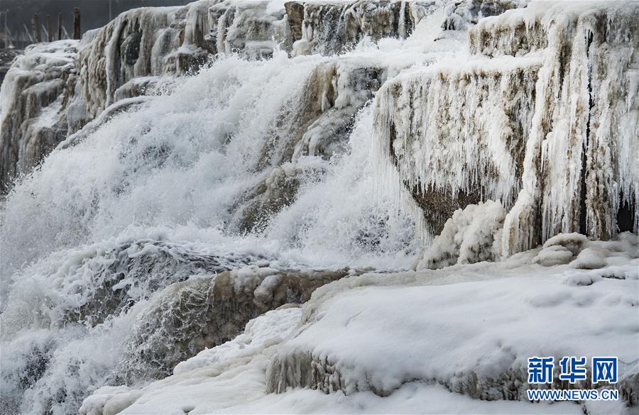 1月12日,陜西黃河壺口瀑布景區(qū)內(nèi)的冰瀑與流動的瀑布形成一幅壯麗的圖畫。新華社記者陶明攝